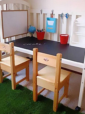 Βγάλτε τα κάγκελα από τη μία πλαϊνή πλευρά, κολλήστε στον πάτο της κούνιας αυτοκόλλητο μαυροπίνακα (θα βρείτε εδώ) και κρεμάστε τα απαραίτητα αξεσουάρ γραφείου!