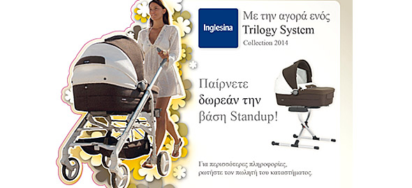 Και για να καλωσορίσει την άνοιξη, η Inglesina σας προσφέρει με την αγορά ενός Trilogy System από την νέα Collection 2014, εντελώς δωρεάν, την πρακτική βάση στήριξης του πορτ-μπεμπέ, την Standup! Η προσφορά ισχύει για τον μήνα Απρίλιο 2014, σε επιλεγμένα σημεία πώλησης έως εξαντλήσεως των αποθεμάτων. Για περισσότερες πληροφορίες, επισκεφτείτε το www.inglesina.gr.
