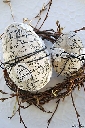 Χρησιμοποιήστε ακόμα και διακοσμητικά φτερά, τα οποία θα κολλήσετε πάνω στα αυγά με ατλακόλ ή ακόμα και σελίδες από παλιά μυθιστορήματα ή εφημερίδες.