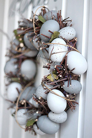 Στην περιφέρεια που έχουν οι πιατέλες μπορείτε να συνθέσετε και στεφάνια που να περικλείουν τα αυγά. Αν, μάλιστα, έχετε χάρτινα, διακοσμητικά αυγά, μπορείτε, μαζί με τα στεφάνια, να τα τοποθετήσετε στον τοίχο ή στην εξώπορτα για να καλωσορίσετε τους καλεσμένους σας.