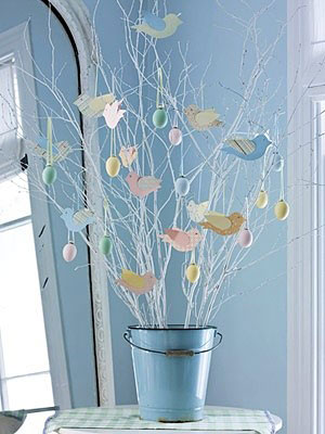 Βάλτε τα κλαδιά σε έναν κουβά (θα σταθούν ευκολότερα εάν τα καρφώσετε σε σφουγγάρι ανθοσυνθέσεων) και αρχίστε να τα στολίζετε με διακοσμητικά αυγουλάκια που θα έχετε βάψει σε διάφορα χρώματα και σχέδια. Καλή ιδέα είναι να τα τρυπήσετε με μια καρφίτσα και να αδειάσετε το περιεχόμενο πριν τα βάψετε.