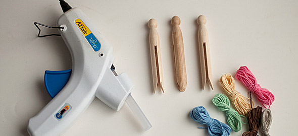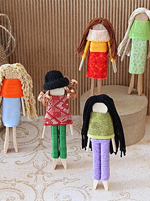 Για τα ρούχα, τυλίξτε στα «πόδια» από τα μανταλάκια νήμα, αφού πρώτα τα έχετε καλύψει με κόλλα σιλικόνης, και χρησιμοποιήστε κομμάτια υφάσματος ως «μπλούζες».