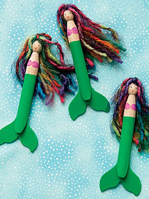 Καταρχάς βάψτε κατά τα 2/3 τα ξυλάκια πλεξίματος με πράσινη (ή σε όποιο άλλο χρώμα θέλετε) ακρυλική μπογιά. Με ανεξίτηλα μαρκαδοράκια σχεδιάστε το μαγιό και το πρόσωπο.
