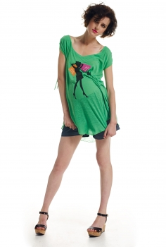 Άνετο τζιν σορτσάκι με λάστιχο, το οποίο μπορεί να φορεθεί σε όλη την διάρκεια της εγκυμοσύνης και πράσινο μπλουζάκι με στάμπα που φοριέται ασορτί. Ένα ιδανικό casual ντύσιμο για καθημερινές βόλτες και ψώνια.
