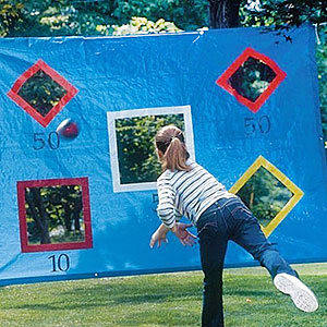 Θα χρειαστείτε έναν μουσαμά (από αυτούς που χρησιμοποιούνται για προστατευτικό κάλυμμα), στον οποίον θα ανοίξετε τρύπες και τετράγωνα και θα βάλετε βαθμολογίες αυξανόμενης δυσκολίας. Σκοπός είναι να περνά η μπάλα που θα πετά το παιδί μέσα από κάθε τρύπα.