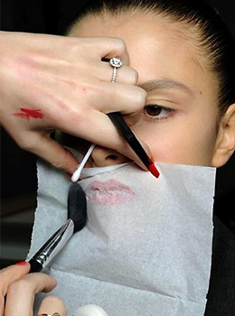 Αφού απλώσετε το κραγιόν, ακουμπήστε ένα λεπτό χαρτομάντιλο πάνω στα χείλη και «περάστε» το σημείο των χειλιών με διάφανη πούδρα.