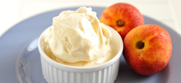 Ξαναβάζετε στην κατάψυξη για 3 ώρες και χτυπάτε και πάλι το παγωτό μέχρι να γίνει λείο και κρεμώδες. Σερβίρετε με φέτες από ροδάκινο και ξηρούς καρπούς (εάν θέλετε).
