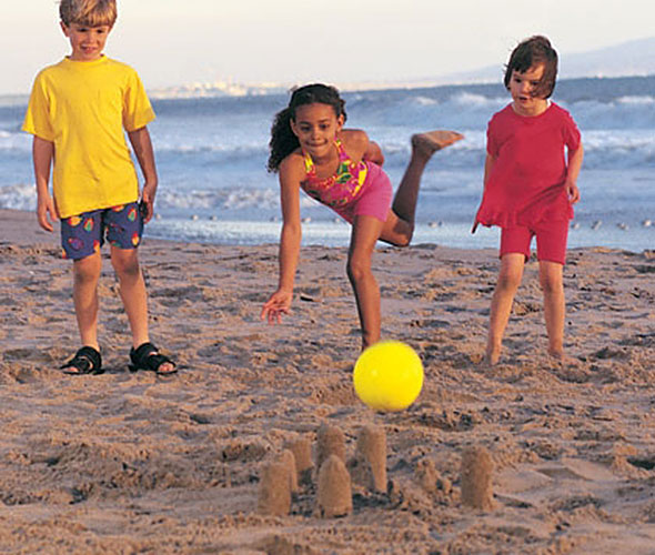 Πηγαίνετε με τα παιδιά στην κοντινότερη παραλία με αμμουδιά. Πάρτε μαζί ένα κουβαδάκι που να είναι ψηλό και στενό και μία μπάλα. Φτιάξτε με το κουβαδάκι και την άμμο «κορίνες» και πείτε στα παιδιά να πετούν την μπάλα από απόσταση, σαν να έπαιζαν bowling,προκειμένου να «ρίξουν» τις κορίνες!