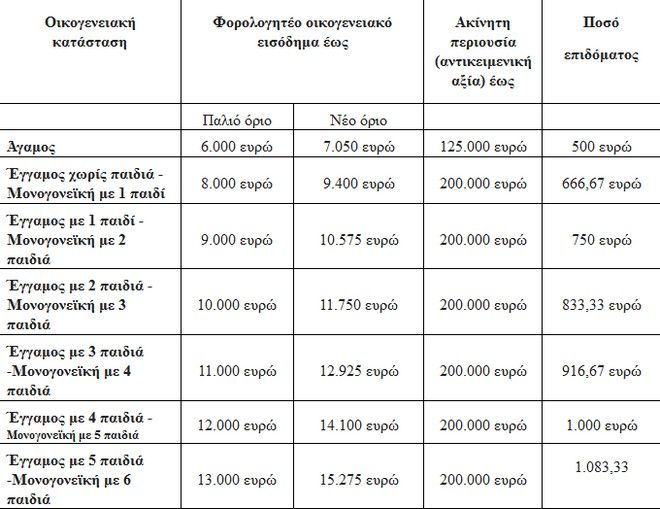 Στον πίνακα που ακολουθεί φαίνεται αναλυτικά ποιο είναι το ποσό του επιδόματος που αναλογεί στους δικαιούχους ανά περίπτωση με βάση το φορολογητέο οικογενειακό εισόδημα και την αντικειμενική αξία από την ακίνητη περιουσία.