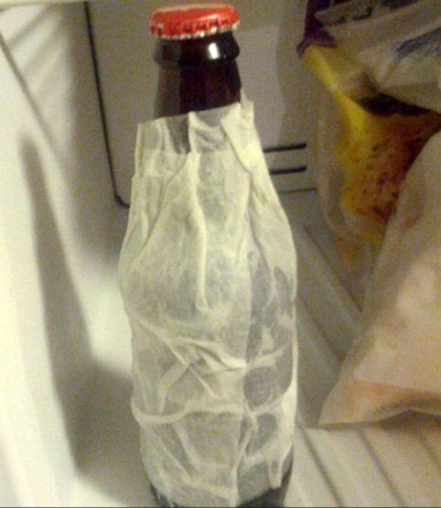 Τυλίξτε γύρω από ένα μπουκάλι μπίρας σε θερμοκρασία δωματίου μια βρεγμένη χαρτοπετσέτα και βάλτε το για λίγο στην κατάψυξη. Έτοιμη!
