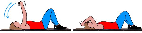 Μπορείτε να κάνετε αυτή την άσκηση με δύο τρόπους, είτε στο πάτωμα είτε όρθια. Θα χρειαστείτε βαράκια σε κάθε περίπτωση. Αν ξαπλώσετε στο πάτωμα, ξαπλώστε με την πλάτη και σηκώστε ψηλά τα χέρια με τα βαράκια, ακριβώς πάνω από το στήθος. Κρατήστε ελαφρώς λυγισμένους τους αγκώνες και στην συνέχεια σπρώξτε τα χέρια ψηλά στο κεφάλι μέχρι το σημείο που τα βαράκια θα ακουμπήσουν το πάτωμα. Σηκώστε τα πάλι ψηλά και επαναλάβετε 15 φορές. Στην περίπτωση που κάνετε αυτήν την άσκηση όρθια, σταθείτε με πόδια ελαφρώς λυγισμένα. Κρατήστε το βαράκι πάνω από το κεφάλι και στην συνέχεια λυγίστε τους αγκώνες σε γωνία 90 μοιρών. Επαναλάβετε 15 φορές.