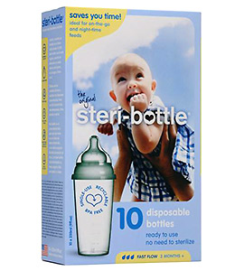 Όταν βρίσκεστε σε ταξίδι, το συνεχές πλύσιμο και στέγνωμα των μπιμπερό του μωρού αποτελεί μια από τις μεγαλύτερες αγγαρείες. Μπορείτε, όμως, να απαλλαχθείτε και από αυτή τη δουλειά, με τη βοήθεια των Steri-Bottles. Τα αποστειρωμένα αυτά μπιμπερό μιας χρήσης σας διευκολύνουν στο τάισμα του μωρού όταν βρίσκεστε στον δρόμο, σε ταξίδι, σε εκδρομή και οπουδήποτε αλλού εκτός σπιτιού. Με το τέλος του γεύματος, απλώς το πετάτε και τελειώσατε, συν του ότι είναι 100% ανακυκλώσιμα, χωρίς την επικίνδυνη ουσία δισφαινόλη Α (BPA).