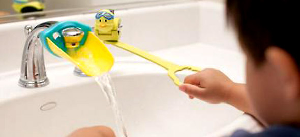 Ένας από τους εφιάλτες των γονιών, και ειδικά της μαμάς, είναι το γεμάτο νερά μπάνιο που αφήνουν τα πιτσιρίκια όταν αρχίζουν να διεκδικούν την... αυτονομία τους και θέλουν να πλένουν μόνα τους τα χέρια και το πρόσωπό τους. Η καλύτερη λύση σε αυτή την περίπτωση είναι το Aqueduck handle extender. Πρόκειται για μια προέκταση για το στόμιο της βρύσης, η οποία βοηθά το νερό να φτάνει κοντά στα παιδιά προκειμένου να μην πιτσιλούν παντού και έχει ένα μακρύ χερούλι που τα βοηθάει να φτάνουν καλύτερα για να ανοιγοκλείνουν τη βρύση.