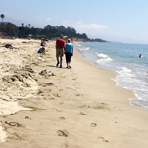 Το ζευγάρι που κάνει βόλτα στην παραλία, χέρι-χέρι, χαιρετώντας χαρούμενα τους λουόμενους