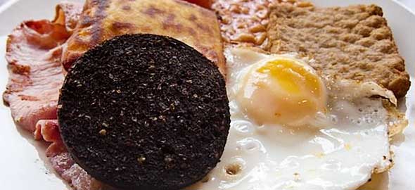 Ένα πλήρες Αγγλικό πρωινό αποτελείται από: Μπέικον, αυγά, ψητή ντομάτα, μανιτάρια, ψωμί, μαύρη πουτίγκα και ψητά φασόλια. Και φυσικά ένα φλιτζάνι τσάι.