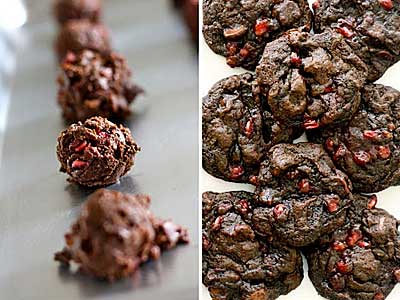 Παίρνετε με το χέρι κομμάτια ζύμης στο μέγεθος καρυδιού (περίπου 30 γρ.) και τα αραδιάζετε στη λαμαρίνα φροντίζοντας να έχουν 5 εκ. απόσταση μεταξύ τους. (Δεν χρειάζεται να πλάσετε λείες μπαλίτσες ζύμης. Όταν τα κομμάτια της ζύμης έχουν ανώμαλη και τραχιά επιφάνεια, τα cookies αποκτούν πιο ελκυστική εμφάνιση όταν ψηθούν).