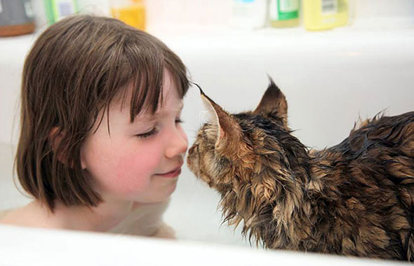 Ακόμα και το μπάνιο πια είναι παιχνίδι. Παλιότερα η μικρή αντιπαθούσε τη διαδικασία του λουσίματος, αλλά από τότε που έγινε φίλη με την γατούλα, έγινε ένα αγαπημένο της παιχνίδι.