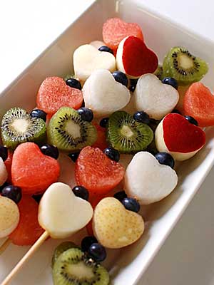 Με φρούτα κομμένα σε σχήμα καρδιάς φτιάχνετε αυτά τα πολύχρωμα σουβλάκια και προσφέρετε στα παιδιά σας λίγη έξτρα αγάπη. Μπορείτε να κάνετε πολλούς συνδυασμούς, όπως ακτινίδια, φράουλες, μπανάνες και πορτοκάλια. Για να τα κόψετε σε σχήμα καρδιάς θα σας βοηθήσει ένα μικρό κουπ-πατ.