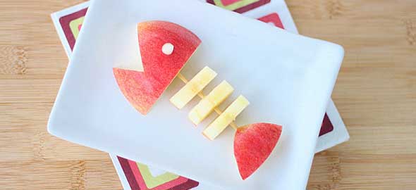 Εάν ψάχνετε για μια πολύ γρήγορη ιδέα, τι πιο απλό από ένα αστείο ψάρι από μήλο; Παίρνετε ένα ξυλάκι από αυτά που χρησιμοποιούνται για τα σουβλάκια και περνάτε τα κομματάκια μήλου που έχετε κόψει στο ανάλογο σχήμα.