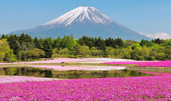 Ροζ βρύα απλώνονται στην βάση του όρους Fuji, δημιουργώντας μία απόκοσμη αντίθεση με τα δέντρα που περιβάλλουν την περιοχή.