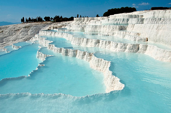 Οι θερμές πηγές στα αμφιθεατρικά βράχια του Pamukkale αποτελούν σημαντικό τουριστικό αξιοθέατο της Τουρκίας, ενώ αμέτρητοι ταξιδιώτες βρίσκουν εκεί ένα χαλαρωτικό καταφύγιο.