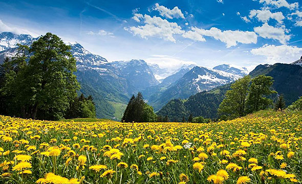 Απέραντες εκτάσεις πικραλίδων απλώνονται στο πίσω μέρος των Ελβετικών Άλπεων, δημιουργώντας ένα εντυπωσιακό θέαμα.