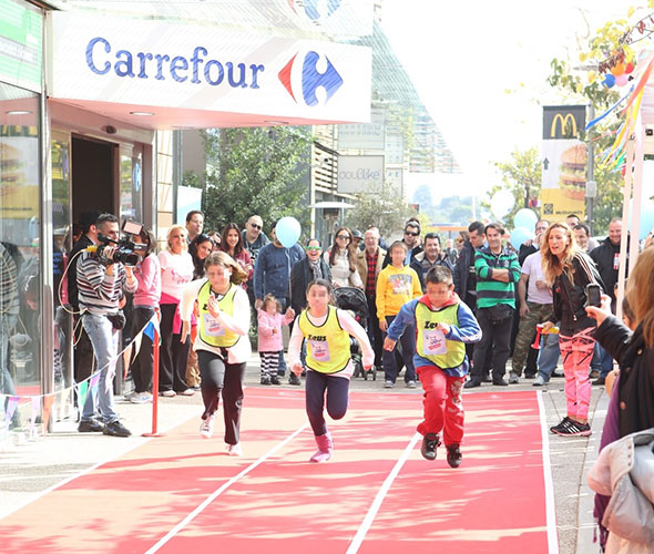 Τα παιδιά έτρεξαν σε έναν «αγώνα δρόμου 100 μέτρων» έξω από το κατάστημα υπό την «καθοδήγηση» της γνωστής ολυμπιονίκου στίβου Πηγής Δεβετζή, η οποία φωτογραφήθηκε και μοιράστηκε μαζί τους «αθλητικά μυστικά επιτυχίας». Παράλληλα, μέσα στο κατάστημα η δημοσιογράφος & παρουσιάστρια Χριστίνα Λαμπίρη «εμψύχωνε» τους παίκτες που συμμετείχαν σε έναν «διαφορετικό αγώνα» καροτσιών super market, με στόχο τη συγκέντρωση όσο το δυνατόν περισσότερων προϊόντων για τα παιδιά του Κέντρου « Η ΧΑΡΑ».