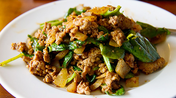 Καθαρίζετε και πλένετε το σπανάκι και το αφήνετε να στραγγίξει. Κόβετε σε μικρά κομμάτια το χοιρινό.