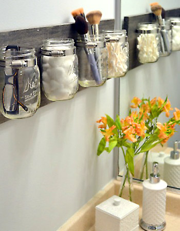 Καρφώστε στον τοίχο του μπάνιου μία βάση πάνω στην οποία θα κρεμάσετε βαζάκια, για να τοποθετείτε εκεί τις οδοντόβουρτσες, τα βαμβάκια και τα ξυραφάκια του συζύγου σας και... ανοίξτε χώρο γύρω από τον νιπτήρα.