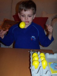 Έχετε δοκιμάσει να πιάσετε ένα αυγό που γκελάρει στο έδαφος; Ναι; Λογικό. Έχετε όμως δοκιμάσει να το πιάσετε κρατώντας ένα δεύτερο αυγό στο λαιμό σας; Στο γόνατο; Έτυχε να χρειάζεται ταυτόχρονα να τρέχετε; Οι Αυγομαχίες (έχει κυκλοφορήσει και με τον τίτλο "Τα αυγά που χορεύουν") δεν είναι ένα παιχνίδι με στρατηγική σκέψη, αλλά θα απαιτήσει την επιδεξιότητα των παιχτών στο μέγιστο. Από τις λίγες περιπτώσεις που μικροί και μεγάλοι ξεκινούν για τη νίκη με τις ίδιες πιθανότητες!