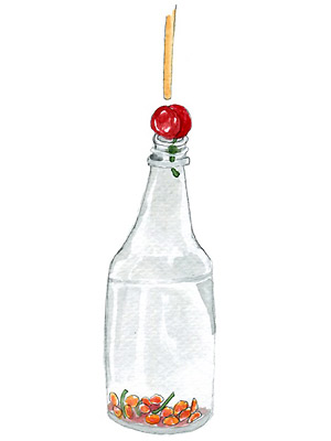 Βρείτε ένα μπουκάλι με στόμιο μικρότερο της διαμέτρου της ελιάς/κερασιού. Τοποθετήστε την ελιά στην κορυφή του μπουκαλιού και με ένα καλαμάκι πιέστε την, ώστε να περάσει την τρύπα του στομίου.