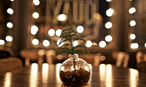 Σε μια παλιά, μεγάλη, χριστουγεννιάτικη μπάλα προσθέστε λίγο νερό (ή και χώμα -για το... εφέ) και ένα κλαράκι από έλατο. Αν δεν διαθέτετε αληθινό δέντρο, μπορείτε να βάλετε οποιοδήποτε πράσινο κλωναράκι - η χριστουγεννιάτικη μπάλα αρκεί για να περάσει το μήνυμα των Χριστουγέννων.