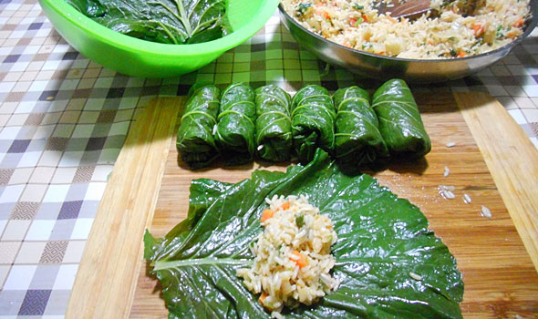 Βάλτε 100 γρ. ελαιόλαδο «να κάψει» και περιχύστε κουταλιά-κουταλιά τα φύλλα.