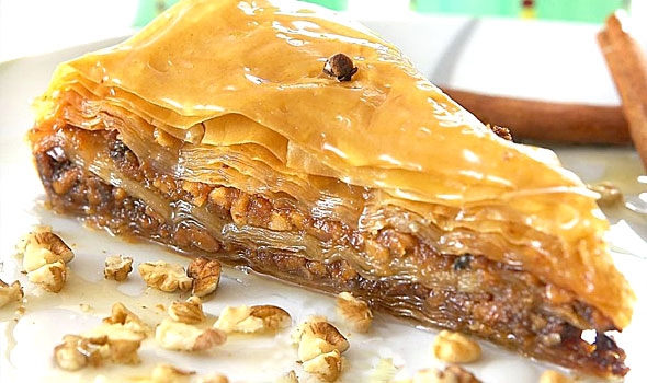 Μόλις η πίτα πάρει χρυσό χρώμα, ρίξτε αργά-αργά με το κρύο σιρόπι και πασπαλίστε με τα καρύδια, την κανέλλα και το γαρύφαλλο.