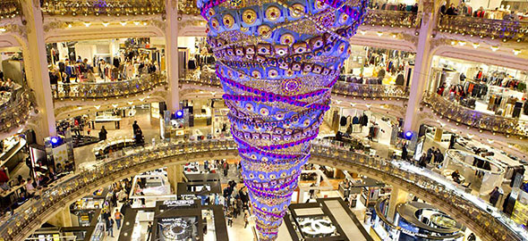 Το ανάποδο χριστουγεννιάτικο δέντρο στο κέντρο του πολυκαταστήματος Galeries Lafayette στο Παρίσι (Γαλλία, 8/12/2014).