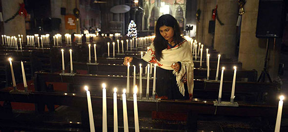 Μία από τις λίγες Χριστιανές στο Πακιστάν ανάβει κεράκι πριν την λειτουργία της περασμένης Κυριακής, που πραγματοποιήθηκε στη μνήμη των θυμάτων από το αιματοκύλισμα στο σχολείο Peshawar (Πακιστάν, 21/12/2014).