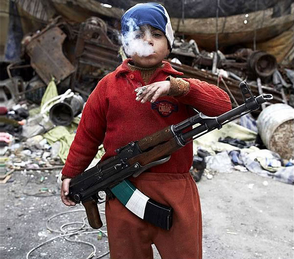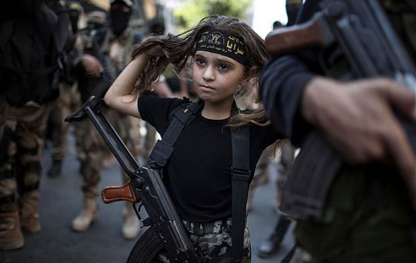 Κορίτσι από την Παλαιστίνη με το καλάσνικοφ κρεμασμένο πάνω της, ανάμεσα σε τζιχαντιστές στρατιώτες στην Γάζα.