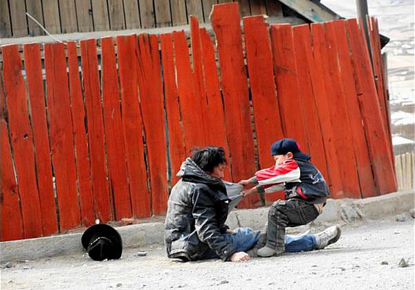Αγόρι προσπαθεί να σηκώσει τον αλκοολικό πατέρα του.