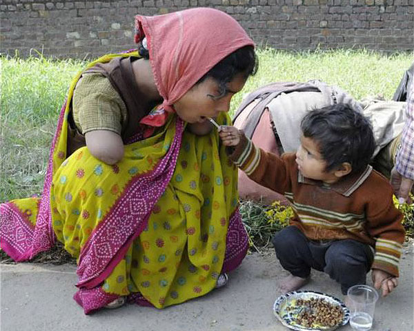 Δίχρονο αγόρι προσπαθεί να ταΐσει την ανάπηρη μητέρα του.