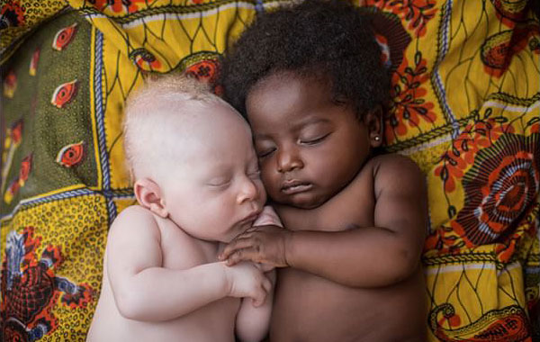 Νεογέννητο 3 εβδομάδων με αλμπινισμό, κοιμάται μακάριο δίπλα στο ξαδερφάκι του, στο Κονγκό.