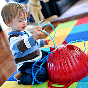 Ένα απλό στραγγιστήρι για μακαρόνια και μερικά πολύχρωμα στικς «καθαριστές πίπας», τα οποία θα βρείτε σε καταστήματα που πωλούν υλικά για χειροτεχνίες, είναι τα μόνα που χρειάζεστε για να απασχοληθεί ένα 2χρονο παιδί για ώρα. Η δραστηριότητα αυτή σκοπό έχει να εξασκήσει την λεπτή κινητικότητα του παιδιού.