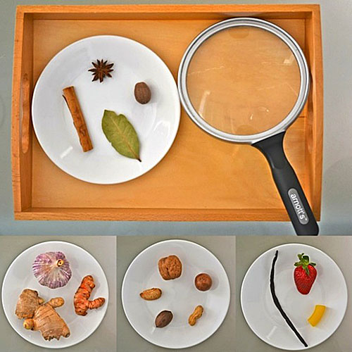 Έχετε έναν μεγάλο μεγεθυντικό φακό; Αρκεί, για να τον βάλει το παιδί πάνω από φυσικά αντικείμενα (φύλλα, καρπούς, φρούτα και λαχανικά) και να τα παρατηρήσει σε βάθος μεγαλύτερο από αυτό που βλέπει κανείς με γυμνό μάτι. Σίγουρα θα ενθουσιαστεί.