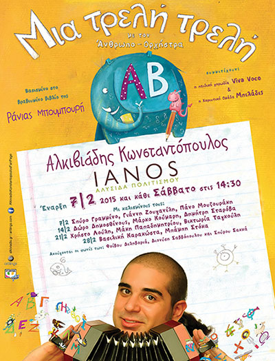 Η συναυλία «Μια τρελή τρελή Αλφαβήτα με τον Άνθρωπο-Ορχήστρα» είναι μια παιδική διαδραστική παράσταση, που συνδυάζει τη μάθηση με το θέατρο και τη μουσική. Βασίζεται στο ομότιτλο βιβλίο της της Ράνιας Μπουμπουρή (Εκδόσεις Ψυχογιός), που έχει τιμηθεί με τον Έπαινο Ποίησης της Γυναικείας Λογοτεχνικής Συντροφιάς, έχει μελοποιηθεί εκπληκτικά από τον Αλκιβιάδη Κωνσταντόπουλο και συγκαταλέγεται ανάμεσα στα best seller της παιδικής λογοτεχνίας!