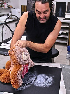 Εμπνευστείτε από τον Αυστραλό καλλιτέχνη Geoffrey Ricardo, ο οποίος απλώνει ένα λεπτό στρώμα μπογιάς στο μπροστινό μέρος του αγαπημένου αρκούδου του παιδιού και στη συνέχεια το πιέζει σε ένα μαύρο χαρτόνι.