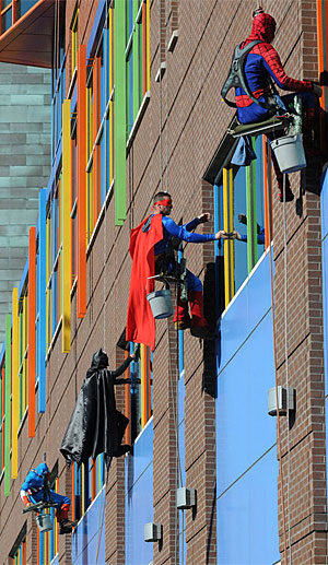 Εργαζόμενοι σε συνεργείο καθαρισμού στο Memphis καθαρίζουν τα παράθυρα της παιδιατρικής κλινικής In Le Bonheur ντυμένοι σούπερ-ήρωες, για να διασκεδάζουν τους μικρούς ασθενείς.