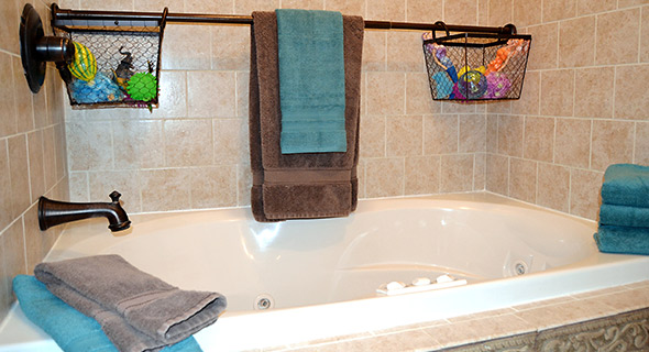 Μία ράγα για τις πετσέτες μπορεί να εξυπηρετήσει και για να κρεμάσετε 2-3 καλάθια, μέσα στα οποία θα συγκεντρώνονται και θα στραγγίζουν τα παιχνίδια που έχουν τα παιδιά στο μπάνιο.