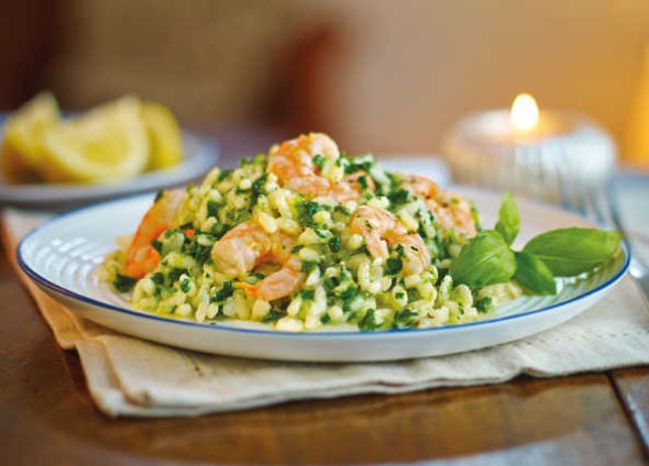 Περιχύνετε με το χυμό του λεμονιού, το υπόλοιπο λάδι και 2 φλιτζάνια νερό και αφήνετε το φαγητό να βράσει σε χαμηλή φωτιά για 40'-45'. Λίγο πριν ολοκληρωθεί το μαγείρεμα, προσθέτετε τις σοταρισμένες γαρίδες, αλατοπιπερώνετε το σπανακόρυζο και ανακατεύετε καλά.