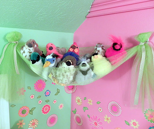 Κρεμάστε μία αυτοσχέδια αιώρα από τούλι σε μία γωνία του δωματίου, στην οποία θα καρφώσετε δύο γάντζους, και κερδίστε χώρα από ράφια και κρεβάτια για τα λούτρινα αρκουδάκια τους.