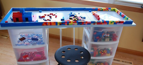 Θα χρειαστείτε μια μεγάλη βάση για Lego, την οποία μπορείτε να παραγγείλετε online από εδώ, η οποία θα λειτουργήσει ως το πάνω μέρος του τραπεζιού, και 6 συρταρωτά πλαστικά κουτιά, πάνω στα οποία θα τοποθετήσετε -ή και θα κολλήσετε- τη βάση, μέσα στα οποία θα βάλετε τα τουβλάκια. Έτσι θα έχουν πάντα ένα μέρος για να παίζουν με τα τουβλάκια τους, και στο τέλος θα τα τακτοποιούν πανεύκολα.