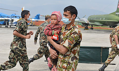 Νεπαλέζος στρατιώτης μεταφέρει διασωθέν μωρό στο αεροδρόμιο του Κατμαντού, στις 30 Απριλίου, προκειμένου να δεχθεί την απαραίτητη φροντίδα από ειδικές ομάδες που έχει αποστείλει στην περιοχή το Συμβούλιο των Ηνωμένων Εθνών.